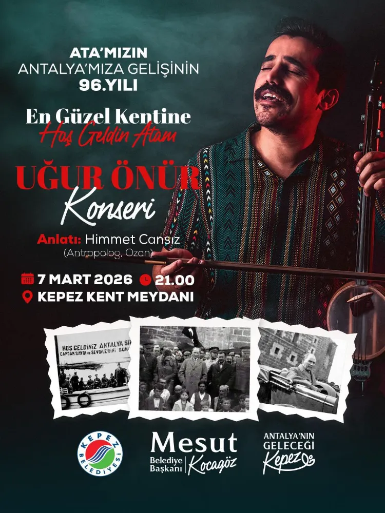 Kepez’de Türkiye Cumhuriyeti’nin kurucusu Mustafa Kemal Atatürk’ün Antalya’ya gelişinin 96. yılı anlamına yakışır etkinliklerle taçlandırılacak. “En güzel kentine hoş geldin Atam” temasıyla düzenlenecek gecede, Türk halk müziğinin güçlü sesi Uğur Önür, sahne alacak. Gecede ayrıca Antropolog ve Ozan Himmet Cansız, Atatürk’ün Antalya’ya gelişinin izlerini, tarihimizden kesitler ve en özel notlarla anlatacak. Katılımcılar, bu özel gece boyunca hem müzikle hem de hatıralarla tarih yolculuğuna çıkacak. Etkinlik, 7 Mart Cumartesi günü saat 21.00’da Kepez Kent Meydanı’nda gerçekleştirilecek.
