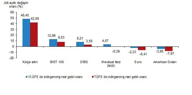 Altı aylık değerlendirmeye göre külçe altın; Yİ-ÜFE ile indirgendiğinde %48,45, TÜFE ile indirgendiğinde ise %42,09 oranlarında yatırımcısına en yüksek reel getiri sağlayan yatırım aracı olurken; aynı dönemde Amerikan Doları Yİ-ÜFE ile indirgendiğinde %3,85, TÜFE ile indirgendiğinde ise %7,97 oranlarında yatırımcısına en çok kaybettiren yatırım aracı oldu.