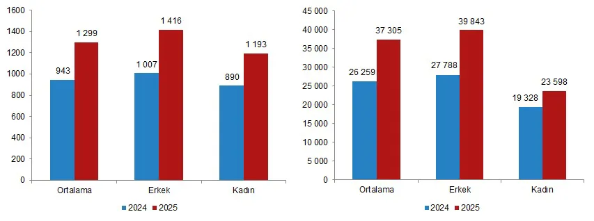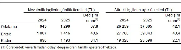 Tarımsal işletmelerde 2025 yılında mevsimlik tarım işçilerinin günlük ücretleri bir önceki yıla göre %37,8 artarak 1 299 TL, sürekli tarım işçilerinin aylık ücretleri ise %42,1 artarak 37 bin 305 TL oldu.