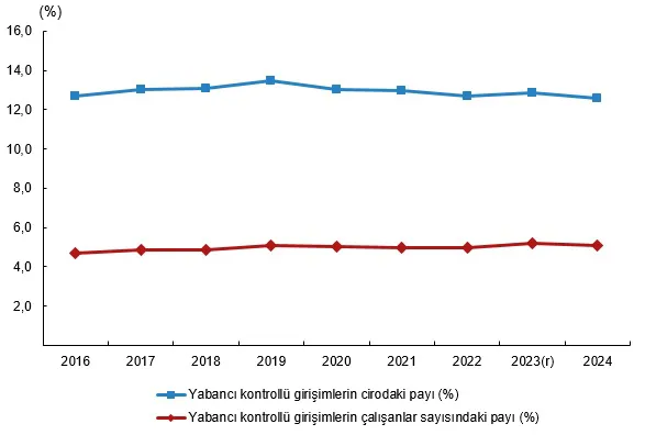 Yabancı kontrollü girişim istatistiklerine göre yabancı kontrolündeki girişim sayısı 2023 yılında 10 bin 673 ve 2024 yılında 11 bin 86 oldu. Bu girişimlerin toplam cirodaki payı 2023 yılında %12,9, 2024'te ise %12,6 oldu. Yabancı kontrollü girişimlerdeki çalışanlar sayısının toplam çalışanlar sayısı içinde payı 2023 yılında %5,2, 2024'te ise %5,1 oldu.