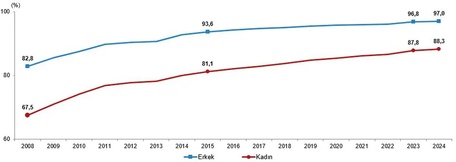 Ulusal Eğitim İstatistiklerine göre en az bir eğitim düzeyini tamamlayan 25 ve daha yukarı yaştaki nüfusun toplam nüfus içindeki oranının 2008-2024 yılları arasında arttığı görüldü. En az bir eğitim düzeyini tamamlayan 25 ve daha yukarı yaştaki bireylerin toplam nüfus içindeki oranı, 2008 yılında %75,1 iken 2024 yılında %92,6 oldu. Bu oran cinsiyete göre incelendiğinde, 2008 yılında en az bir eğitim düzeyini tamamlayan 25 ve daha yukarı yaştaki kadınların oranı %67,5, erkeklerin oranı %82,8 iken, bu oran 2024 yılında kadınlarda %88,3, erkeklerde ise %97,0 oldu.