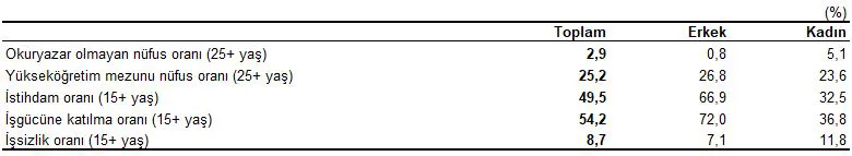 İşgücüne katılma oranı eğitim durumuna göre incelendiğinde, kadınların eğitim seviyesi yükseldikçe işgücüne daha fazla katıldıkları görüldü. Okuryazar olmayan kadınların işgücüne katılma oranı %14,6, lise altı eğitimli kadınların işgücüne katılma oranı %27,5, lise mezunu kadınların işgücüne katılma oranı %38,5, mesleki veya teknik lise mezunu kadınların işgücüne katılma oranı %43,8 iken, yükseköğretim mezunu kadınların işgücüne katılma oranı %68,7 oldu.
