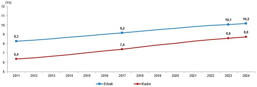 Cinsiyete göre ortalama eğitim süresi, 2011-2024