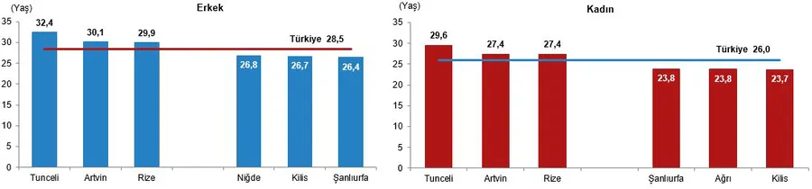 Evlenme İstatistiklerine göre resmi olarak ilk evliliğini 2025 yılında yapmış olan kadınların ortalama evlenme yaşı 26,0 iken erkeklerin ortalama evlenme yaşı 28,5 oldu. Ortalama ilk evlenme yaşının en yüksek olduğu il, kadınlarda 29,6 yaş, erkeklerde 32,4 yaş ile Tunceli oldu. Ortalama ilk evlenme yaşının en düşük olduğu il ise kadınlarda 23,7 yaş ile Kilis, erkeklerde 26,4 yaş ile Şanlıurfa oldu.