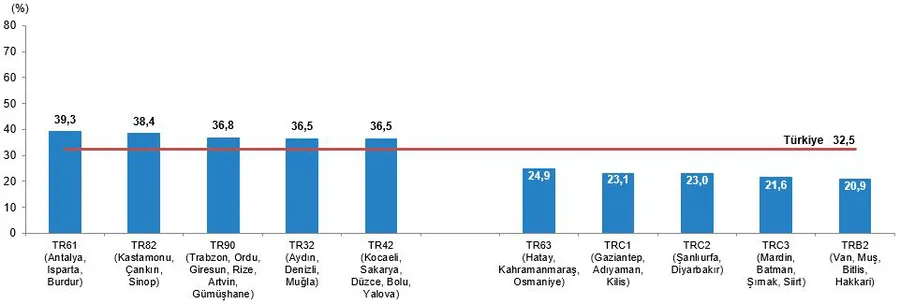 En yüksek istihdam oranı %54,7 ile TR61 (Antalya, Isparta, Burdur) bölgesinde, en düşük istihdam oranı ise %39,5 ile TRC3 (Mardin, Batman, Şırnak, Siirt) ve TRB2 (Van, Muş, Bitlis, Hakkari) bölgelerinde gerçekleşti.