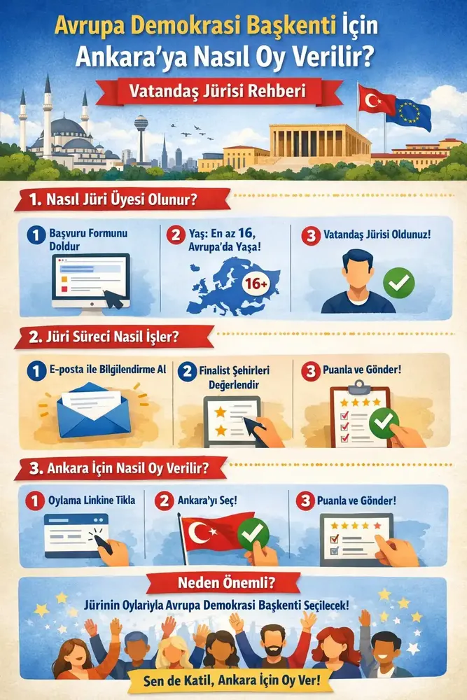 2027 Avrupa Demokrasi Başkenti unvanı, Avrupa genelinde oluşturulacak Yurttaş Jürisi oylamasıyla belirlenecek. Ankara’nın bu süreçte demokratik deneyimini Avrupa kamuoyuyla paylaşacağı ve katılımcı demokrasi alanındaki çalışmalarını ileri taşımayı hedeflediği bildirildi.