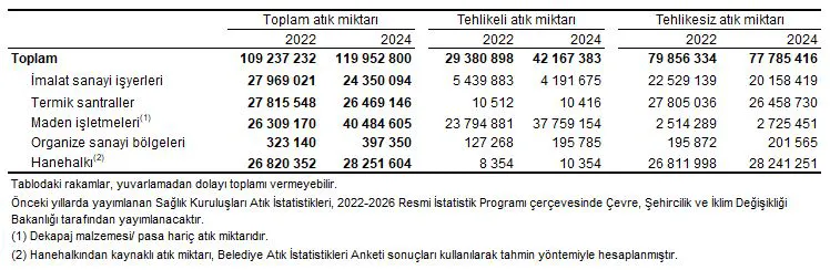 (1) Madencilik sektörü verilerinde dekapaj malzemesi/pasa miktarı hariç tutulmuştur. Ham petrol ve doğalgaz çıkarımı yapan işletmeler, 2024 referans yılı itibarıyla madencilik sektörü kapsamına dahil edilmiştir. Önceki yıllarda yayımlanan Sağlık Kuruluşları Atık İstatistikleri, 2022-2026 Resmi İstatistik Programı çerçevesinde Çevre, Şehircilik ve İklim Değişikliği Bakanlığı tarafından yayımlanmaktadır.