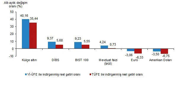 Altı aylık değerlendirmeye göre külçe altın; Yİ-ÜFE ile indirgendiğinde %40,16, TÜFE ile indirgendiğinde ise %35,44 oranlarında yatırımcısına en yüksek reel getiri sağlayan yatırım aracı olurken; aynı dönemde Amerikan Doları Yİ-ÜFE ile indirgendiğinde %3,50, TÜFE ile indirgendiğinde ise %6,75 oranlarında yatırımcısına en çok kaybettiren yatırım aracı oldu.