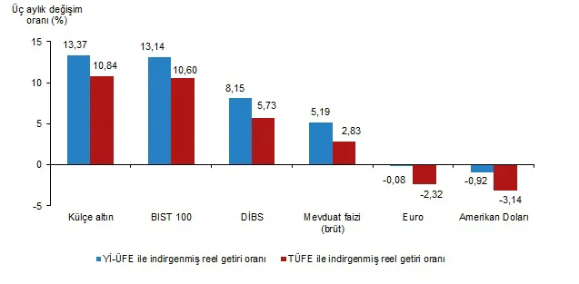 Külçe altın, üç aylık değerlendirmede; Yİ-ÜFE ile indirgendiğinde %13,37, TÜFE ile indirgendiğinde ise %10,84 oranlarında yatırımcısına en yüksek reel getiri sağlayan yatırım aracı oldu. Aynı dönemde Amerikan Doları, Yİ-ÜFE ile indirgendiğinde %0,92, TÜFE ile indirgendiğinde ise %3,14 oranlarında yatırımcısına en çok kaybettiren yatırım aracı oldu.