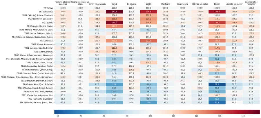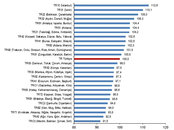 Türkiye'nin 2024 yılı sonuçlarına göre fiyat düzeyi endeksi en yüksek bölgesi 112,6 ile TR10 (İstanbul), en düşük bölgesi ise 91,5 ile TRC3 (Mardin, Batman, Şırnak, Siirt) oldu. Bu endeks değerleri, TR10 (İstanbul)'un Türkiye ortalamasına göre %12,6 pahalı, TRC3 (Mardin, Batman, Şırnak, Siirt)'ün ise %8,5 daha ucuz olduğunu göstermiştir.