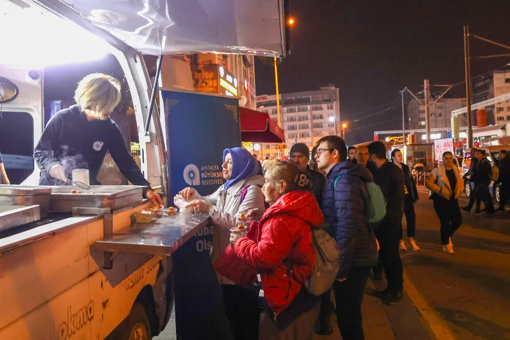 Antalya merkez ilçelerde Muratpaşa Camii önünde 3 bin 500 kişiye, Kepez Uyaroğlu Camii önünde ise bin 500 kişiye sıcak lokma ikramı yapıldı. Büyükşehir Belediyesi, Antalya’nın 19 ilçesinde ise özel olarak hazırlanan 10 bin kişilik kandil simidi vatandaşlara ikram etti. Vatandaşlar ikramlara yoğun ilgi gösterirken, Regaip Kandili’nin manevi ikliminde birlik, beraberlik ve paylaşma duygusu hep birlikte yaşandı.