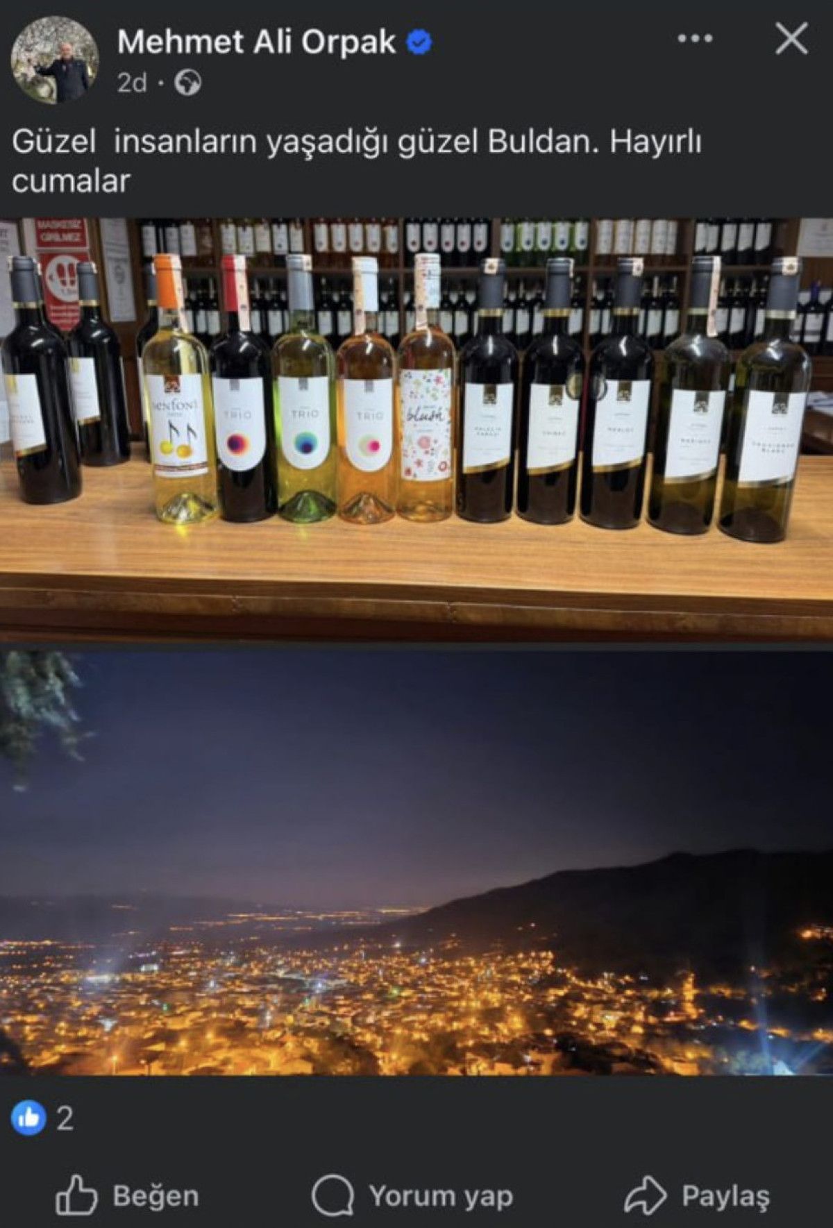 Belediye Başkanı Orpak, “Güzel insanların yaşadığı güzel Buldan, hayırlı cumalar” ifadelerini kullandığı paylaşımına, Buldan manzarasıyla alkol şişelerinin bulunduğu iki fotoğrafı birleştirdi.