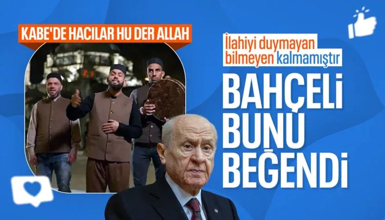 Bahçeli, "Yine bugünlerde dağa taşa Allah dedirten, her yaş grubunda göz kamaştıran bir akıma dönüşen 'Kabe’de Hacılar hu der Allah' isimli ilahiyi ve bu ilahiyi seslendiren kardeşimizi de gönülden alkışlıyoruz." ifadelerini kullandı.