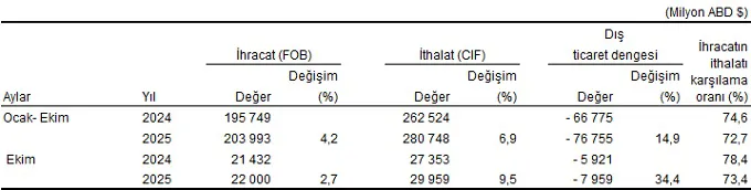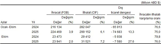 Ekim ayında dış ticaret açığı bir önceki yılın aynı ayına göre %27,6 artarak 5 milyar 938 milyon dolardan, 7 milyar 580 milyon dolara yükseldi. İhracatın ithalatı karşılama oranı 2024 Ekim ayında %79,8 iken, 2025 Ekim ayında %76,0'a geriledi.