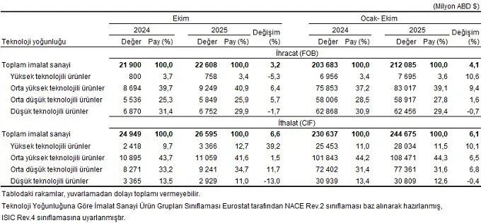 Teknoloji yoğunluğuna göre imalat sanayi ürünleri dış ticareti, Ekim 2025