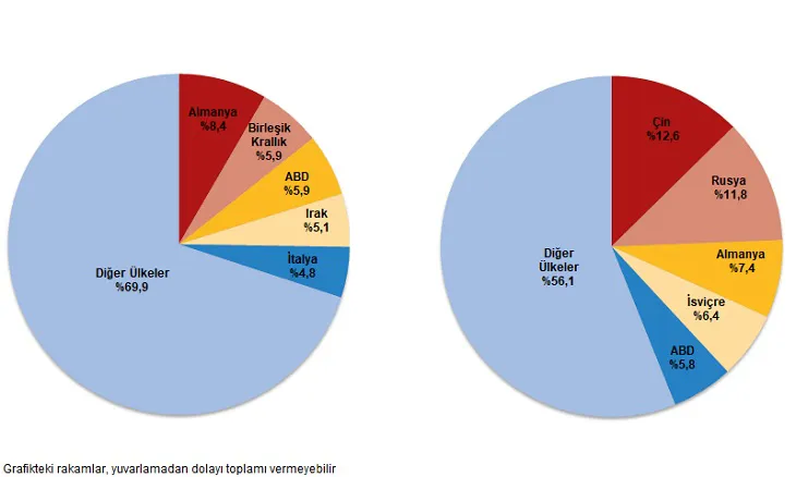 İthalatta Çin ilk sırayı aldı. Ekim ayında Çin'den yapılan ithalat 3 milyar 977 milyon dolar olurken, bu ülkeyi sırasıyla; 3 milyar 712 milyon dolar ile Rusya Federasyonu, 2 milyar 326 milyon dolar ile Almanya, 2 milyar 5 milyon dolar ile İsviçre, 1 milyar 828 milyon dolar ile ABD izledi. İlk 5 ülkeden yapılan ithalat, toplam ithalatın %43,9'unu oluşturdu.
