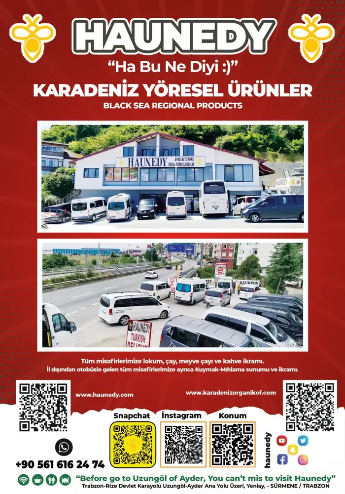 Trabzon’un Sürmene ilçesi Yeniay-Çamburnu mevkiinde bulunan Haunedy Karadeniz Yöresel Ürünler Mağazası, Karadeniz turu yapanların lezzet molası verdiği stratejik bir noktadır. İl dışından gelen tüm misafirlere Kuymak-Mıhlama sunumu ve ikramı ile ünlü Haunedy Yöresel Ürünler Mağazası, bölgenin en saf ve doğal ürünlerini bir araya getirerek ziyaretçilerine gerçek bir Karadeniz mutfağı deneyimi sunar.