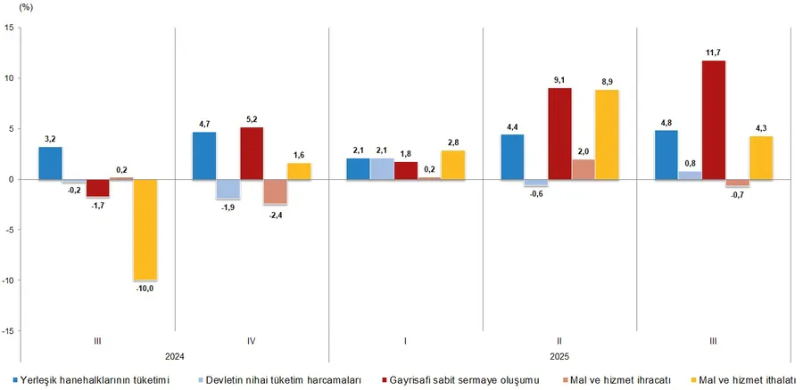 Yerleşik hanehalklarının nihai tüketim harcamaları 2025 yılının üçüncü çeyreğinde bir önceki yılın aynı çeyreğine göre zincirlenmiş hacim endeksi olarak %4,8 arttı. Devletin nihai tüketim harcamaları %0,8, gayrisafi sabit sermaye oluşumu ise %11,7 arttı.