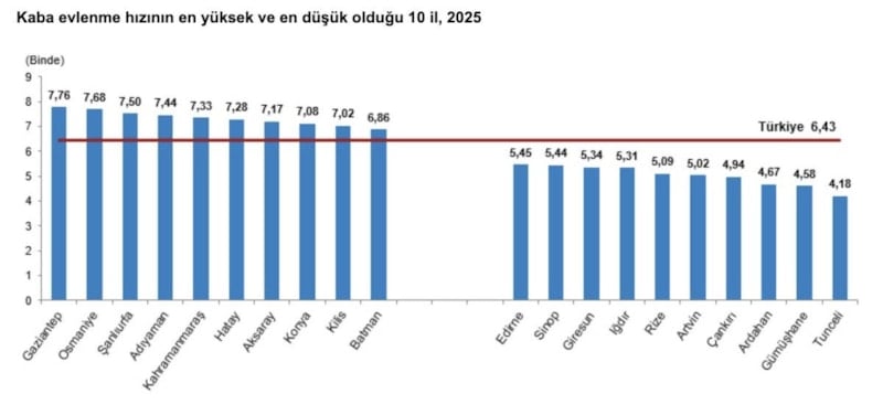 Kaba evlenme hızının 2025 yılında en yüksek olduğu il, binde 7,76 ile Gaziantep oldu. Bu ili binde 7,68 ile Osmaniye, binde 7,50 ile Şanlıurfa izledi. Kaba evlenme hızının en düşük olduğu il ise binde 4,18 ile Tunceli oldu. Bu ili binde 4,58 ile Gümüşhane, binde 4,67 ile Ardahan izledi.