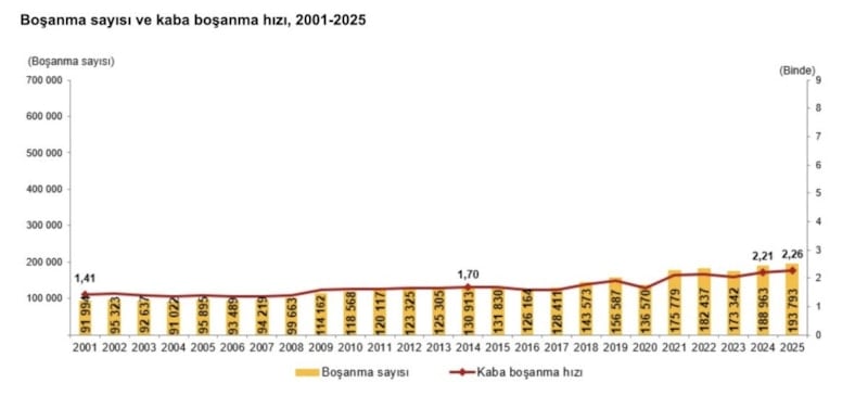 Boşanan çiftlerin sayısı 2024 yılında 188 bin 963 iken 2025 yılında 193 bin 793 oldu. Bin nüfus başına düşen boşanma sayısını ifade eden kaba boşanma hızı 2025 yılında binde 2,26 olarak gerçekleşti.