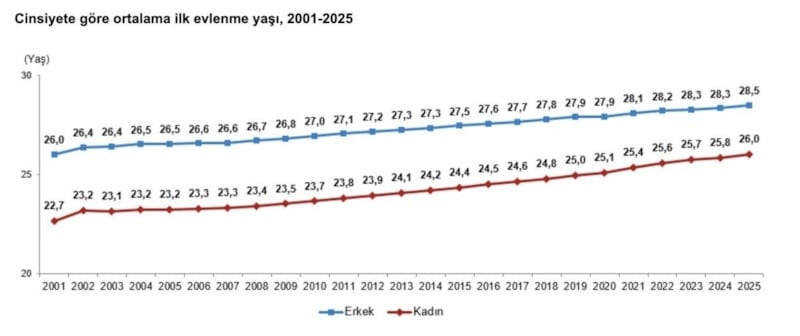 Yıllara göre ortalama ilk evlenme yaşı incelendiğinde, her iki cinsiyette de ilk evlenme yaşının arttığı görüldü. Ortalama ilk evlenme yaşı 2025 yılında erkeklerde 28,5 iken kadınlarda 26,0 oldu. Erkek ile kadın arasındaki ortalama ilk evlenme yaş farkı ise 2,5 yaş olarak gerçekleşti.