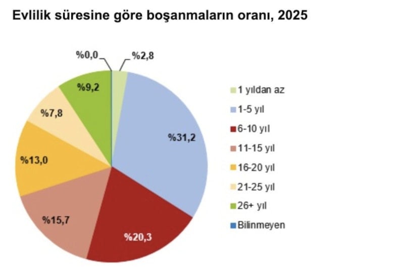 Evlilik süresine göre boşanmalar incelendiğinde, 2025 yılında gerçekleşen boşanmaların yüzde 34'ü evliliğin ilk 5 yılı, yüzde 20,3'ü ise evliliğin 6-10 yılı içinde gerçekleşti.