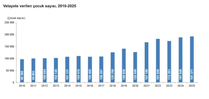 Kesinleşen boşanma davaları sonucunda 2025 yılında 193 bin 793 çift boşanırken 191 bin 371 çocuk velayete verildi. Boşanma davaları sonucu, çocukların velayetinin çoğunlukla anneye verildiği görüldü. Çocukların velayetinin 2025 yılında yüzde 74,6'sı anneye, yüzde 25,4'ü babaya verildi.