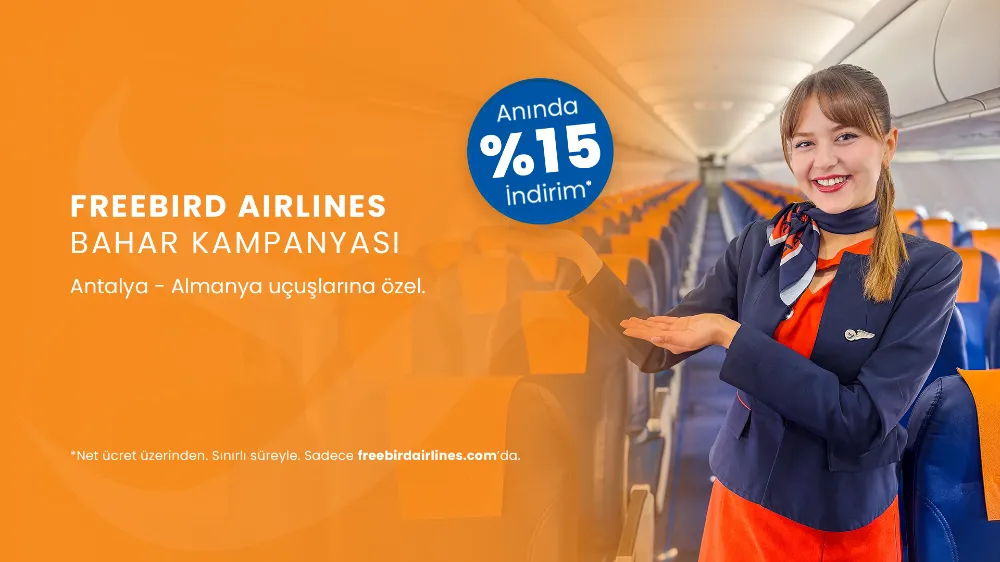 Kampanya kapsamında 19-31 Ocak 2026 tarihleri arasında Freebird Airlines’ın web sitesi üzerinden yapılan biletlemelerde, 1 Mart-31 Mayıs 2026 tarihleri arasındaki seçili uçuşlar için net bilet fiyatı üzerinden %15 indirim uygulanıyor. Antalya ile Almanya arasındaki tüm hatların dahil olduğu kampanya ile yolcular, ilkbahar seyahatlerini daha avantajlı fiyatlarla planlama imkânı buluyor. Türkiye’nin en deneyimli uluslararası havayollarından biri olan Freebird Airlines, yolcularına avantajlı kampanyalar ve müşteri odaklı hizmet anlayışıyla değer sunmaya devam ediyor.