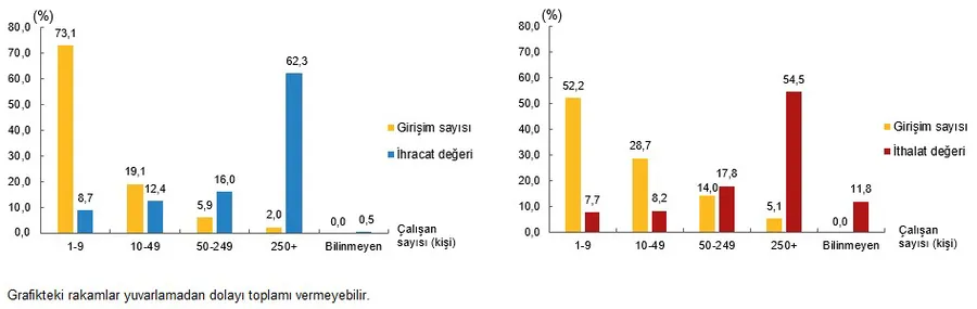 Hizmet ithalatı yapan girişimlerin %52,2'sini oluşturan 1-9 çalışanı olan mikro ölçekli girişimler, hizmet ithalatının %7,7'sini yaptı. Çalışan sayısı 10-49 kişi olan küçük ölçekli girişimlerin hizmet ithalatındaki payı %8,2 olurken 50-249 kişi olan orta ölçekli girişimlerin payı %17,8 oldu. Hizmet ithalatının %54,5'ini, hizmet ithalatı yapan girişimlerin %5,1'ini oluşturan 250 ve daha fazla kişinin çalıştığı büyük ölçekli girişimler gerçekleştirdi.