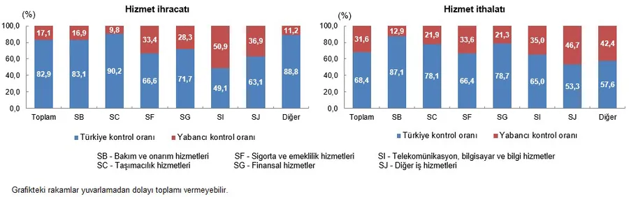 Hizmet ticaretinde en yüksek paya sahip olan taşımacılık hizmetlerinde yapılan ihracatın %90,2'si, ithalatın ise %78,1'i Türkiye kontrolündeki girişimler tarafından gerçekleştirildi. Telekomünikasyon, bilgisayar ve bilgi hizmetleri ihracatında Türkiye kontrollü girişimlerin payı %49,1 iken yabancı kontrollü girişimlerin payı %50,9 oldu. Sigorta ve emeklilik hizmetleri ihracatının %33,4'ü ve ithalatının %33,6'sı yabancı kontrollü girişimler tarafından yapıldı. Finansal hizmetlerde ihracatın %71,7'sini, ithalatın ise %78,7'sini Türkiye kontrollü girişimler gerçekleştirdi.
