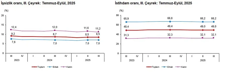 İstihdam edilenlerin sayısı 2025 yılı III. çeyreğinde bir önceki çeyreğe göre 65 bin kişi artarak 32 milyon 558 bin kişi, istihdam oranı ise değişim göstermeyerek %49,0 oldu. Bu oran erkeklerde %66,2 iken kadınlarda %32,1 olarak gerçekleşti.