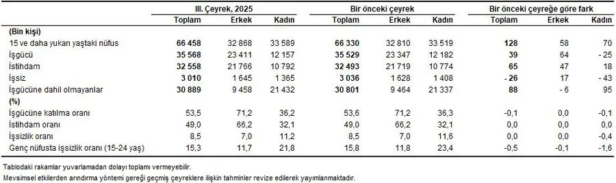 İşgücü, 2025 yılı III. çeyreğinde bir önceki çeyreğe göre 39 bin kişi artarak 35 milyon 568 bin kişi, işgücüne katılma oranı ise 0,1 puanlık azalış ile %53,5 olarak gerçekleşti. İşgücüne katılma oranı erkeklerde %71,2, kadınlarda ise %36,2 oldu.