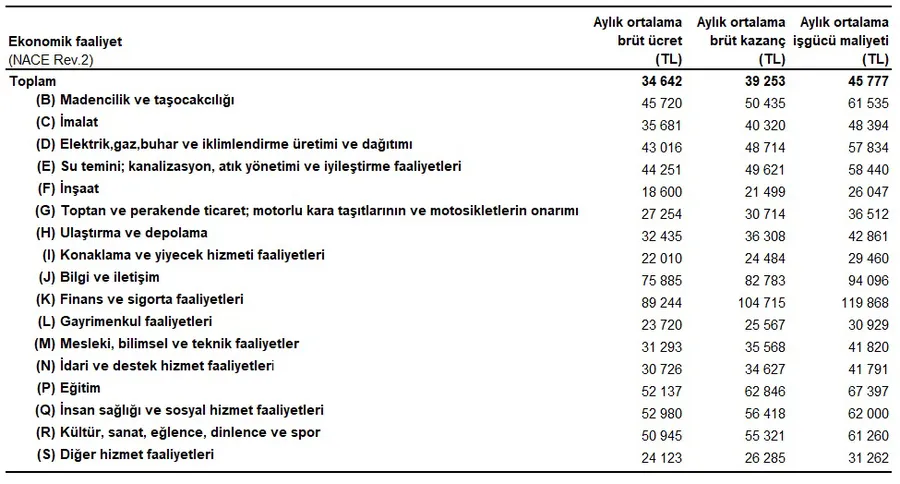 Ekonomik faaliyete göre aylık ortalama brüt ücret, brüt kazanç ve işgücü maliyeti, 2024