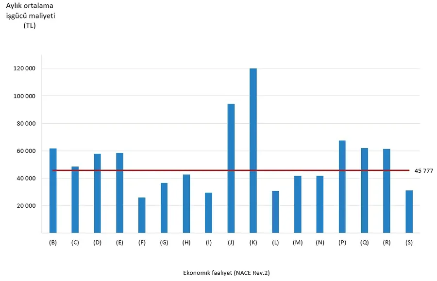 Finans ve sigorta faaliyetleri (K) sektörü, 119 bin 868 TL ile aylık ortalama işgücü maliyetinin en yüksek olduğu sektör oldu. Bu sektörü, 94 bin 96 TL ile bilgi ve iletişim (J) ve 67 bin 397 TL ile eğitim (P) sektörü izledi. İnşaat (F) sektörü ise 26 bin 47 TL ile aylık ortalama işgücü maliyetinin en düşük olduğu sektör oldu. Bu sektörü 29 bin 460 TL ile konaklama ve yiyecek hizmeti faaliyetleri (I) ve 30 bin 929 TL ile gayrimenkul faaliyetleri (L) sektörleri takip etti.