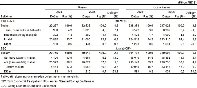 Türkiye İstatistik Kurumu ile Ticaret Bakanlığı iş birliğiyle genel ticaret sistemi kapsamında üretilen geçici dış ticaret verilerine göre; ihracat 2025 yılı Kasım ayında, bir önceki yılın aynı ayına göre %1,3 artarak 22 milyar 536 milyon dolar, ithalat %2,6 artarak 30 milyar 518 milyon dolar olarak gerçekleşti.