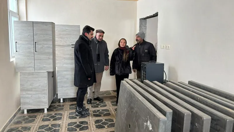 Ziyaret kapsamında, köyde yapımı devam eden taziye evinde incelemelerde bulunan Kaymakam Tutal, çalışmaların son durumu hakkında yetkililerden bilgi aldı.