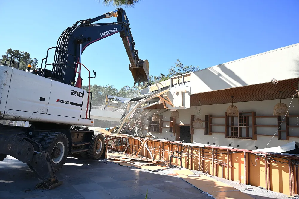 Cuma günü başlanan yıkıma bugün de devam edildi. Yıkımları engellemek için söz konusu otelin girişine park edilen kamyon ve tırlar, jandarma eşliğinde çekicilerle bulundukları yerden kaldırıldı.