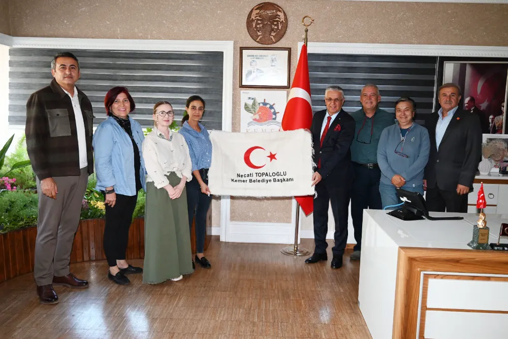 Tekirova Mahallesi’ndeki seramik atölyesinde kurs veren gönüllü seramik eğitmeni Şenay Güngör ve kursiyerler, Kemer Belediye Meclis Üyesi Mustafa Çelik ile Kemer Belediye Başkanı Necati Topaloğlu’nu makamında ziyaret etti.