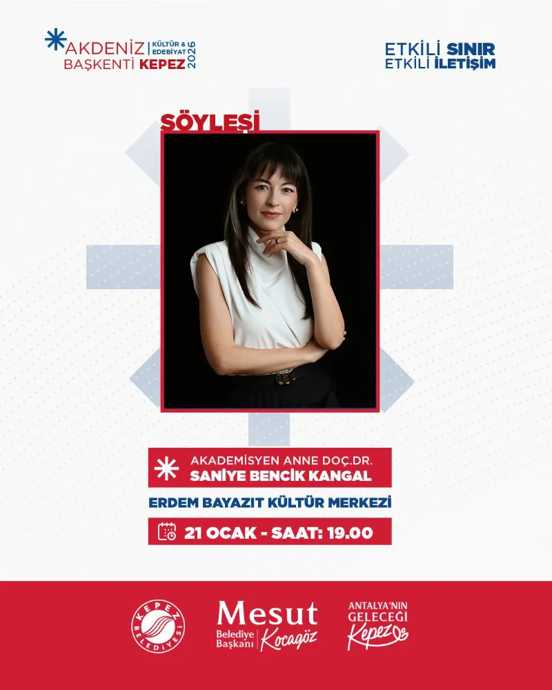 Kepez Belediyesi, Akdeniz Kültür ve Edebiyat Başkenti etkinlikleri kapsamında anlamlı bir söyleşiye ev sahipliği yapıyor. Akademisyen anne Doç. Dr. Saniye Bencik Kangal, Kepez’de “Etkili Sınır – Etkili İletişim” i anlatacak. Söyleşi, 21 Ocak Çarşamba günü saat 19.00’da Erdem Bayazıt Kültür Merkezi’nde gerçekleşecek. Söyleşide, günlük yaşamda ve sosyal ilişkilerde sağlıklı sınırlar koymanın önemi, etkili iletişim stratejileri ve iletişimde sık yapılan hatalar gibi konular ele alınacak. Katılımcılar, Doç. Dr. Saniye Bencik Kangal’ın tecrübelerinden faydalanarak hem kişisel hem de profesyonel yaşamlarında uygulayabilecekleri pratik bilgiler edinebilecekler.