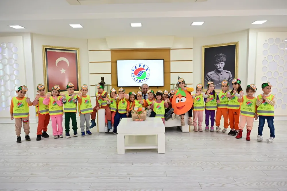 Minikler, ana binadaki başkan yardımcılarına, birim müdürlerine, belediye personeline ve hizmet için binaya gelen vatandaşlara da portakal sularını ikram etti.