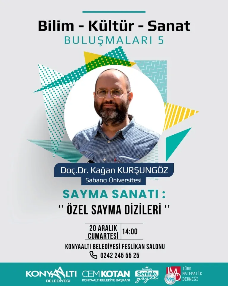 Konyaaltı Belediyesi, Bilim-Kültür-Sanat Buluşmaları’nın beşincisini düzenleyeceğini duyurdu. Konyaaltı Belediyesi Kültür, Sanat ve Sosyal İşler Müdürlüğü’nden edinilen bilgiye göre buluşmanın, ‘Sayma Sanatı: Özel Sayma Dizileri’ konusu altında düzenleneceği aktarıldı. Türk Matematik Derneği ile iş birliği içerisinde Sabancı Üniversitesi Mühendislik ve Doğa Bilimleri Fakültesi Öğretim Üyesi Doç. Dr. Kağan Kurşungöz’ün sunumuyla gerçekleşecek 5’inci Bilim-Kültür-Sanat Buluşması, 20 Aralık Cumartesi günü saat 14.00’te Konyaaltı Belediyesi Ana Hizmet Binası içerisinde bulunan Feslikan Salonu’nda düzenlenecek. Vatandaşlar herhangi bir ücret ödemeden etkinliğe katılabilecek.