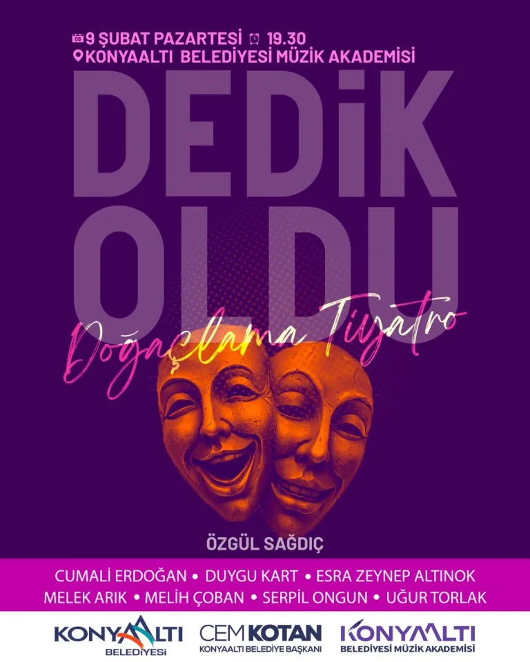 Sanatın ve kültürün birleştirici gücüne her zaman inandıklarını vurgulayan Konyaaltı Belediye Başkanı Cem Kotan, “Müzik Akademimizde eğitim alan öğrencilerin sahne deneyimi kazanarak kendilerini ifade etmeleri bizler için çok kıymetli. ‘Dedik Oldu’ adlı doğaçlama tiyatro oyunu ile hem sanatseverleri keyifli bir akşamda buluşturacak hem de yeni yeteneklerimize destek olacağız. Tüm vatandaşlarımızı, bu güzel etkinliğe davet ediyorum” ifadelerini kullandı.