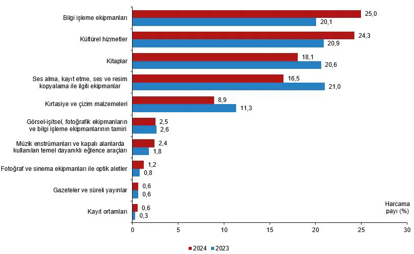 Hanehalklarının kültür harcamaları, 2024 yılında önceki yıla göre %91,5 artarak 203 milyar 807 milyon 948 bin TL oldu. Hanehalklarının 2024 yılında gerçekleştirdiği kültür harcamalarında; bilgi işleme ekipmanları %25,0, kültürel hizmetler %24,3 ve kitaplar %18,1 paya sahip oldu.