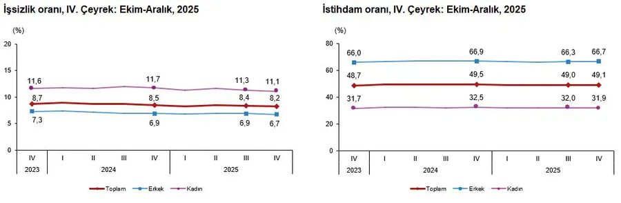 Hanehalkı İşgücü Araştırması sonuçlarına göre; 15 ve daha yukarı yaştaki kişilerde işsiz sayısı 2025 yılı IV. çeyreğinde bir önceki çeyreğe göre 58 bin kişi azalarak 2 milyon 913 bin kişi oldu. İşsizlik oranı ise 0,2 puanlık azalış ile %8,2 seviyesinde gerçekleşti. İşsizlik oranı erkeklerde %6,7, kadınlarda %11,1 olarak tahmin edildi.