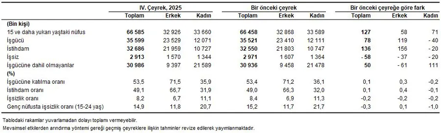İşgücü, 2025 yılı IV. çeyreğinde bir önceki çeyreğe göre 78 bin kişi artarak 35 milyon 599 bin kişi, işgücüne katılma oranı ise 0,1 puanlık artış ile %53,5 olarak gerçekleşti. İşgücüne katılma oranı erkeklerde %71,5, kadınlarda ise %35,9 oldu.