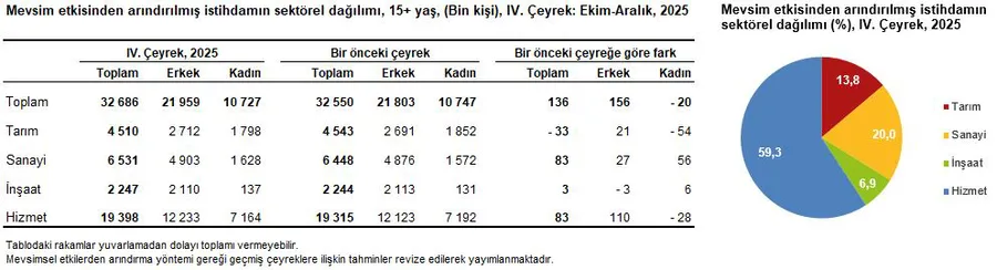 Mevsim etkisinden arındırılmış istihdam edilenlerin sayısı 2025 yılı IV. çeyreğinde bir önceki çeyreğe göre tarım sektöründe 33 bin kişi azalırken, sanayi sektöründe 83 bin kişi, inşaat sektöründe 3 bin kişi, hizmet sektöründe 83 bin kişi arttı. İstihdam edilenlerin %13,8'i tarım, %20,0'ı sanayi, %6,9'u inşaat, %59,3'ü ise hizmet sektöründe yer aldı.