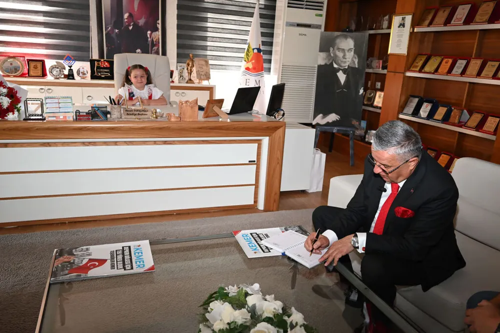 Minik başkanların makam koltuğuna oturduğu anlarda Kemer Belediye Başkan Yardımcısı Mehmet Derya Baytekin ile Kemer Belediyesi Meclis Üyesi Mehmet Akın da yer aldı.