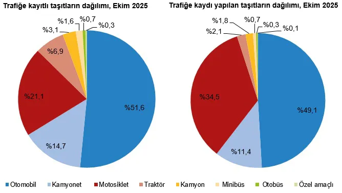 Ekim ayında trafiğe kaydı yapılan taşıtların %49,1'ini otomobil, %34,5'ini motosiklet, %11,4'ünü kamyonet, %2,1'ini traktör, %1,8'ini kamyon, %0,7'sini minibüs, %0,3'ünü otobüs ve %0,1'ini özel amaçlı taşıtlar oluşturdu.