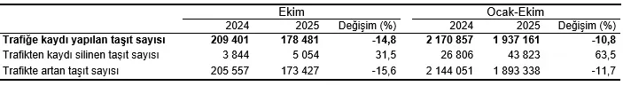 Trafiğe kaydı yapılan ve trafikten kaydı silinen motorlu kara taşıtları, Ekim 2025