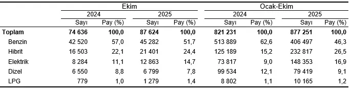 Ocak-Ekim döneminde trafiğe kaydı yapılan 877 bin 251 adet otomobilin %46,3'ü benzin, %26,5'i hibrit, %16,9'u elektrikli, %9,1'i dizel ve %1,2'si LPG yakıtlıdır. Ekim ayı sonu itibarıyla trafiğe kayıtlı 17 milyon 117 bin 983 adet otomobilin ise %32,9'u dizel, %30,8'i benzin, %30,5'i LPG, %3,6'sı hibrit ve %1,9'u elektriklidir. Yakıt türü bilinmeyen(3) otomobillerin oranı ise %0,2'dir.
